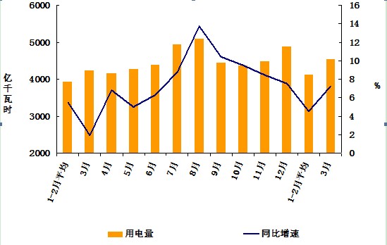 3月份,全國全社會(huì)用電量4544億千瓦時(shí),同比增長7.2%,增速比1-2月份提高2.7個(gè)百分點(diǎn),增速提高主要是上年3月份基數(shù)過低(上年3月份增速為1.9%,為全年最低增速)。分產(chǎn)業(yè)看, 3月份,第一產(chǎn)業(yè)用電量61億千瓦時(shí),同比下降4.3%;第二產(chǎn)業(yè)用電量3312億千瓦時(shí),同比增長7.2%;第三產(chǎn)業(yè)用電量539億千瓦時(shí),同比增長10.5%;城鄉(xiāng)居民生活用電量632億千瓦時(shí),同比增長5.7%。
