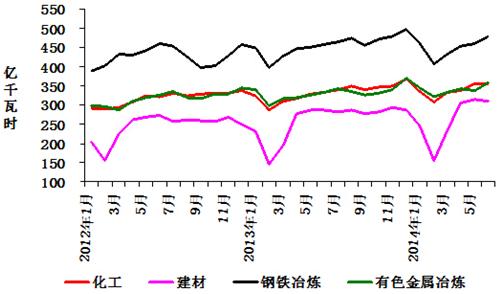1-6月份,化學(xué)原料制品、非金屬礦物制品、黑色金屬冶煉、有色金屬冶煉四大高載能行業(yè)用電量合計(jì)8314億千瓦時(shí),同比增長 4.6%,增速比上年同期提高0.4個(gè)百分點(diǎn);合計(jì)用電量占全社會(huì)用電量的比重為31.6%,對(duì)全社會(huì)用電量增長的貢獻(xiàn)率為27.8%。其中,化工行業(yè)用電量2025億千瓦時(shí),同比增長5.2%,增速比上年同期提高0.7個(gè)百分點(diǎn);建材行業(yè)用電量1563億千瓦時(shí),同比增長9.3%,增速比上年同期提高6.2個(gè)百分點(diǎn);黑色金屬冶煉行業(yè)用電量2689億千瓦時(shí),同比增長1.7%,增速比上年同期回落1.9個(gè)百分點(diǎn),對(duì)全社會(huì)用電量增長的貢獻(xiàn)率僅為3.3%;有色金屬冶煉行業(yè)2037億千瓦時(shí),同比增長4.7%,增速比上年同期回落1.0個(gè)百分點(diǎn)。
